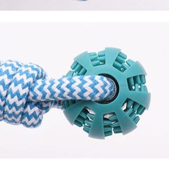 丈夫なロープの先端に歯磨き効果のあるゴムボールが付いた犬のおもちゃです。