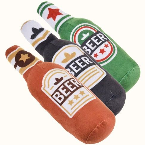 ユニークなビール瓶をモチーフにした犬のおもちゃです。 中に鳴き笛が入っており噛むと音が鳴る仕組みで愛犬の興味を引きつけます。 やわらかな素材で作られたぬいぐるみなので安心して遊ばせることができます。 星のマークとラベルデザインが本物そっくりでユーモアたっぷり。 小型犬から中型犬まで楽しめるサイズ感で日々の遊びやストレス解消に最適です。