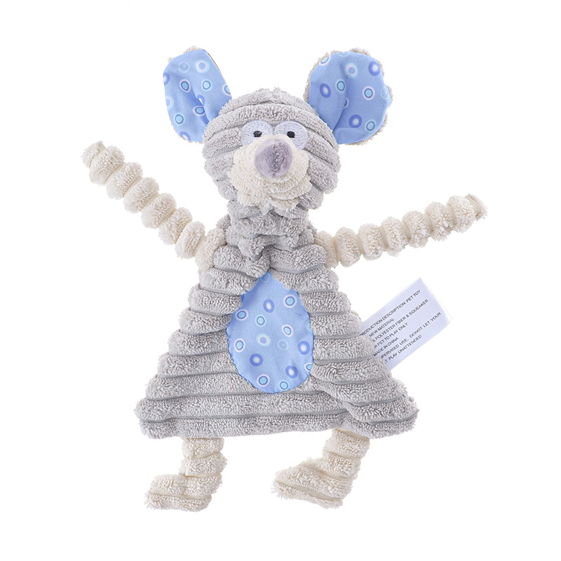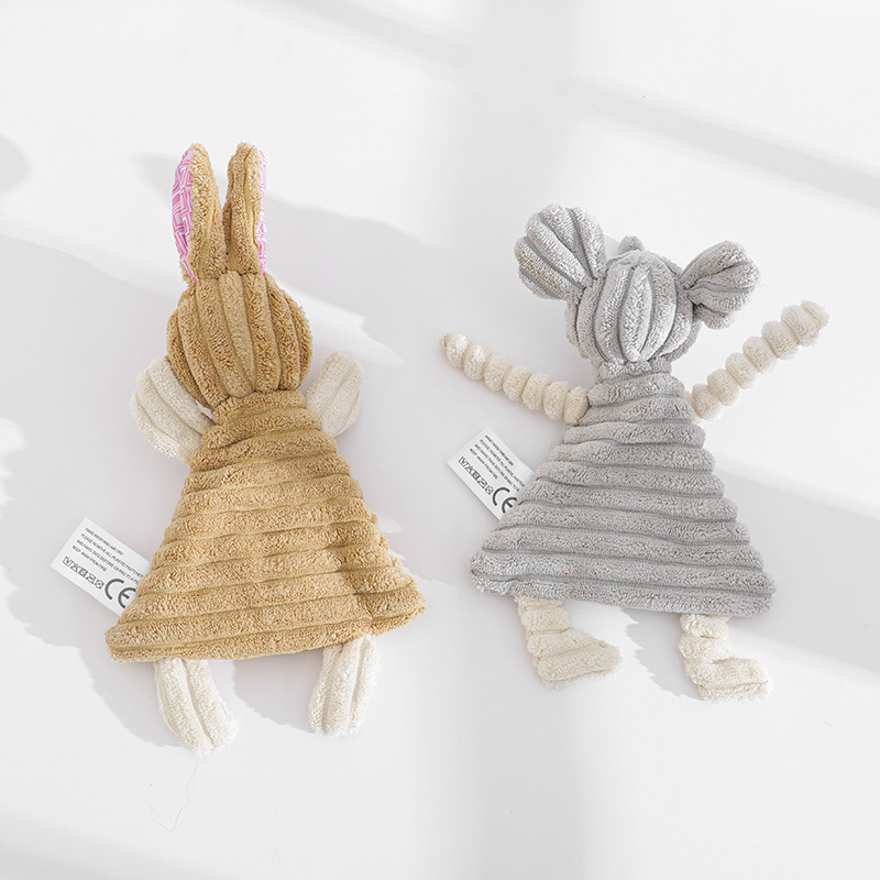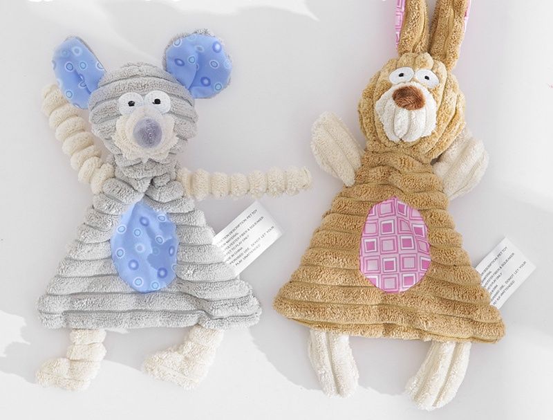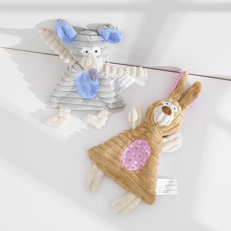 長い耳が特徴的なうさぎとねずみをモチーフにした犬のおもちゃのぬいぐるみです。 柔らかなコーデュロイ素材の胴体と、弾力性のある手足が噛んだり引っ張ったりする遊びに最適です。 お腹には歯固めにもなる凹凸のある素材を使用しており、愛犬の歯の健康をサポートします。 軽量で持ち運びしやすく、投げて遊ぶこともできる万能なぬいぐるみです。 二種類のデザインからお選びいただけます。