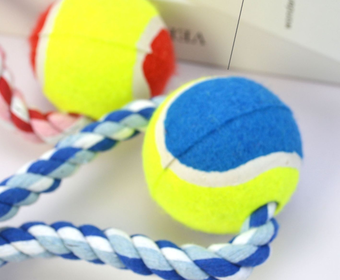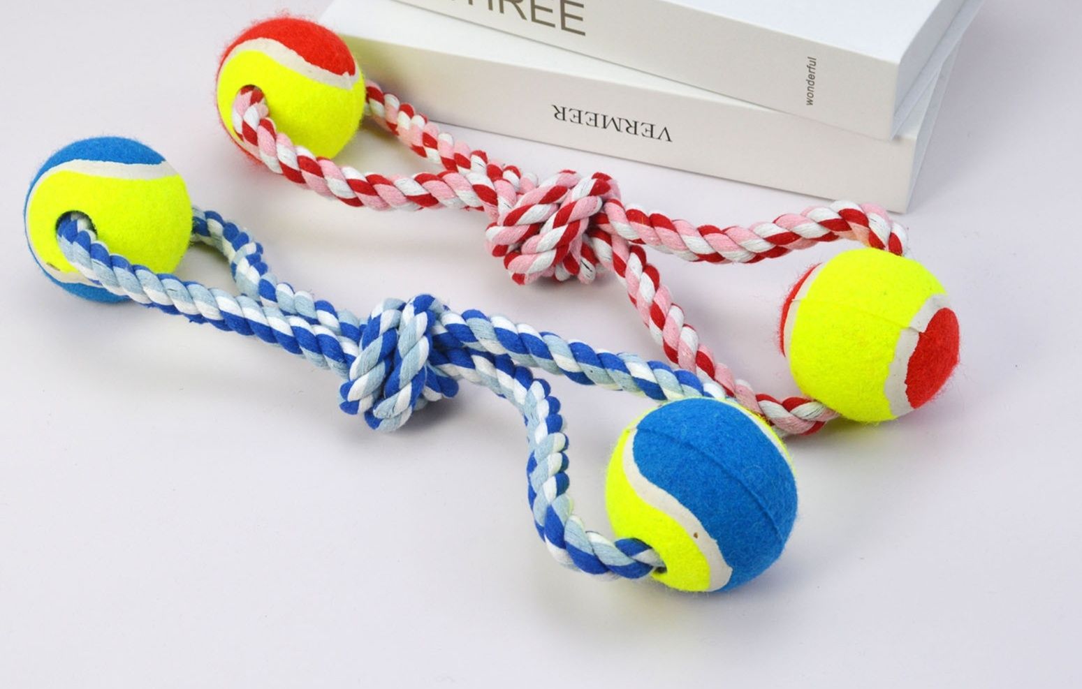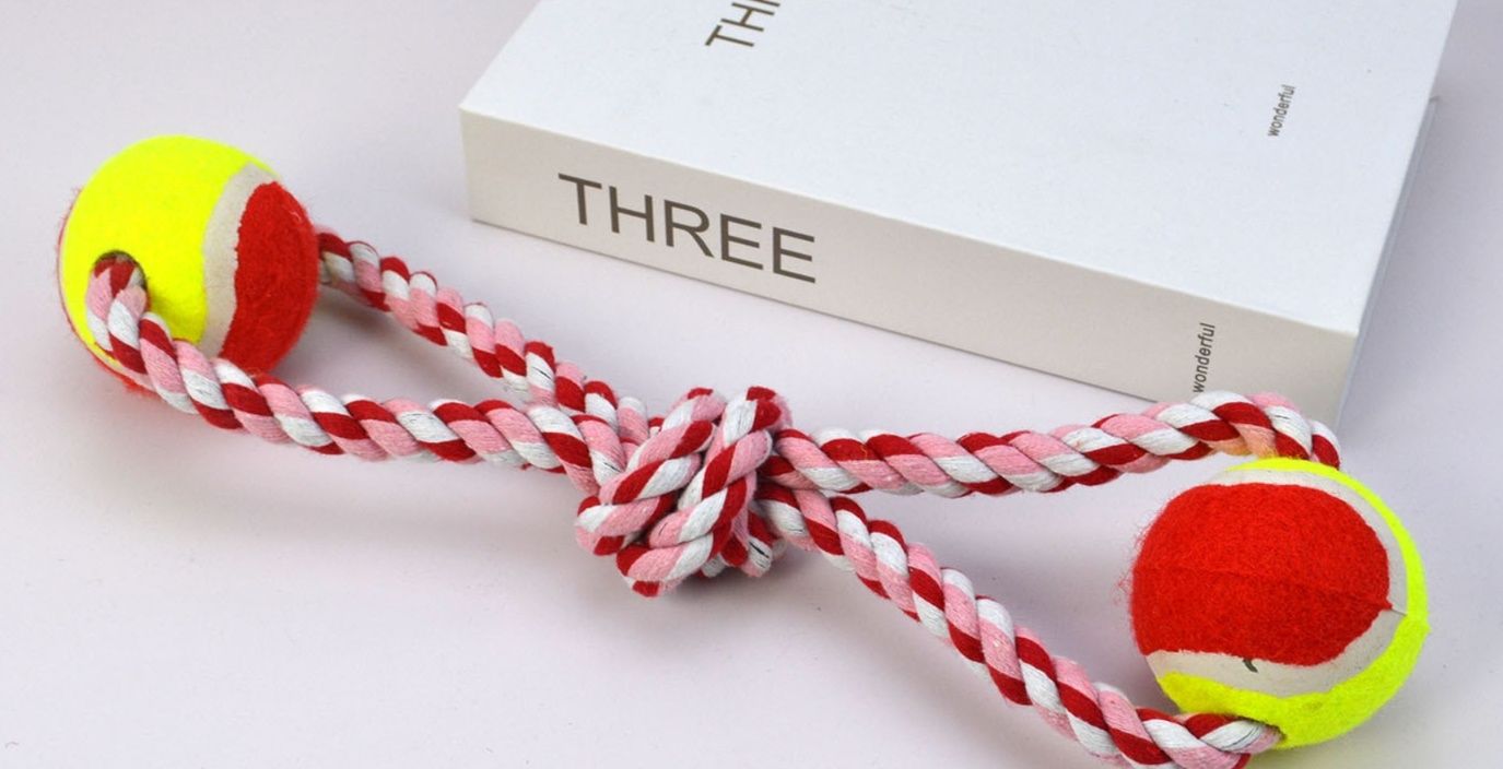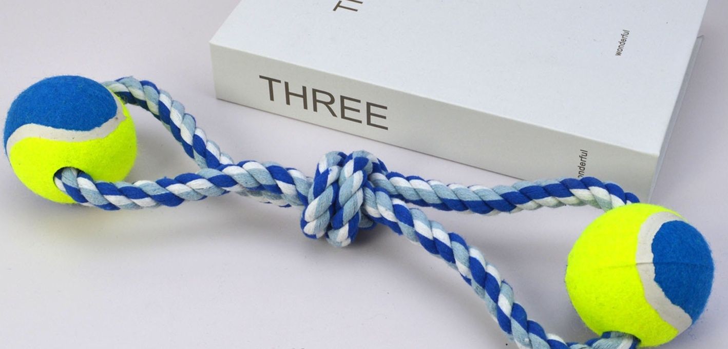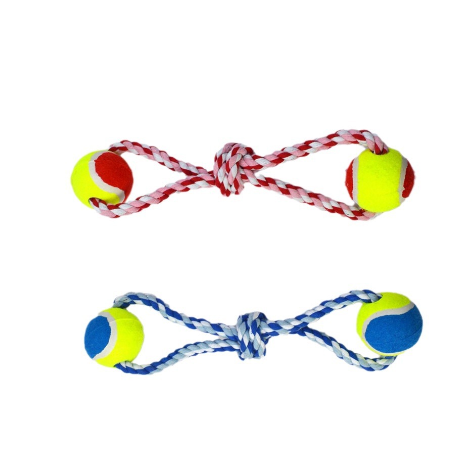 丈夫な編み込みロープの両端にテニスボールを装着した犬のおもちゃです。 中央部分には噛み応えのある結び目を施し、愛犬のストレス解消と歯の健康維持をサポートします。 引っ張り遊びや投げて取ってくる遊びに最適なロープ玩具で、飼い主様との楽しいコミュニケーション時間を演出します。 全長約35センチメートルで小型犬から中型犬まで幅広くお使いいただけます。