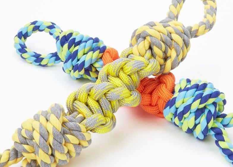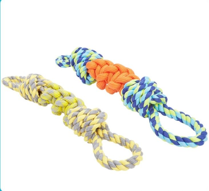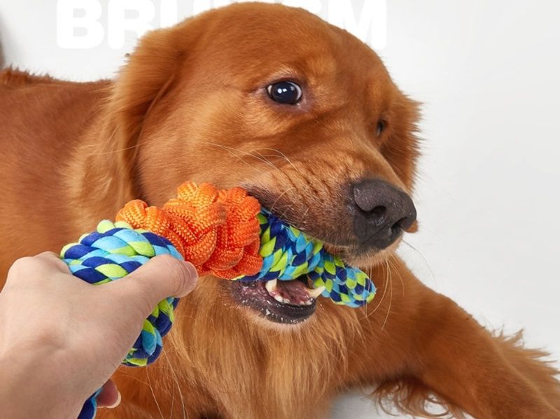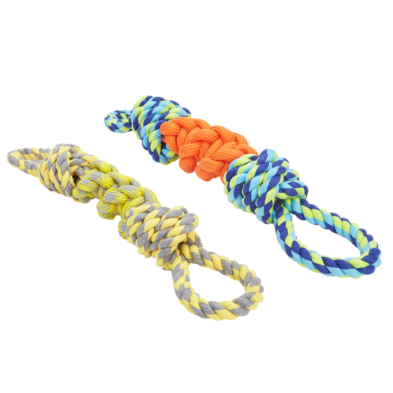 丈夫な編み込み加工が施された犬のおもちゃのロープです。 持ち手部分には輪っか状の持ち手が付いており、飼い主様との引っ張り遊びに最適な設計になっています。 中央部分には大きな結び玉が施されており、噛み応えも抜群です。 ロープの素材は丈夫で長持ちするため、活発なワンちゃんの遊び相手にぴったりです。 ストレス解消や歯の健康維持にも役立つ犬のおもちゃです。
