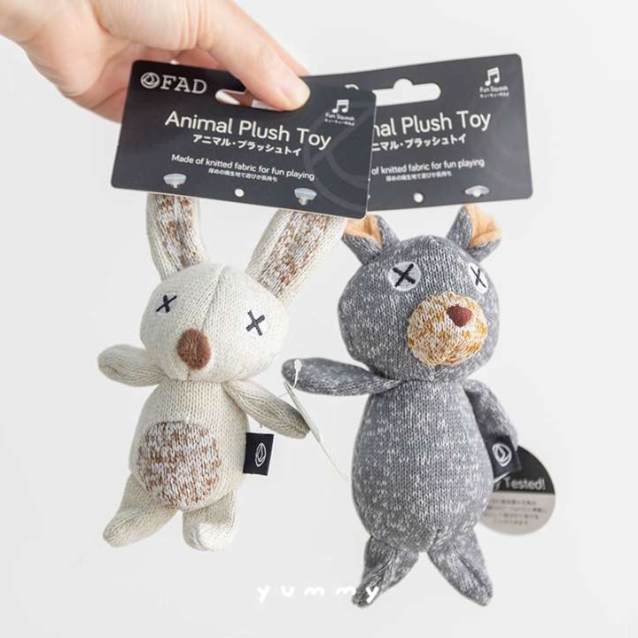手触り良い編み物生地で作られた愛らしい動物のぬいぐるみ。 目がクロスしたユニークなデザインの犬のおもちゃです。 犬や兎などの小動物モチーフで、愛犬が夢中になる遊び心あふれる作りです。 子供から大人まで楽しめる癒しのインテリアとしても最適なぬいぐるみです。